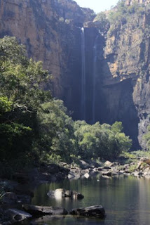 Nach einer kleinen Pause hier ging es dann ein kurzes Stück weiter zu den Jim Jim Falls. Ein Glück, dass diese erst seit wenigen Tagen wieder zugänglich sind. Also dorthin per 4WD (eine andere Möglichkeit gibt es nicht), und wieder über gewaltige Felsen geklettert, ehe wir an einem kleinen niedlichen Sandstrand ankamen. Touristen gab es nur eine Handvoll. Also hinein in das schöne Nass, zum Wasserfall geschwommen (ist doch weiter als gedacht), sich dort eine kleine Rückenmassage gegönnt und noch etwas in der Sonne entspannt.